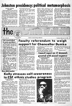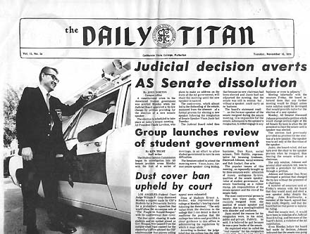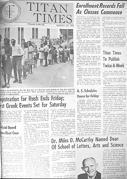 Daily Titan history and reunion pages ![]() When "Orange County State College" first offered classes in 1959, the dean of students and student leaders acted quickly to establish a campus paper. They called it the Titan Times, and its first issue appeared Jan. 4, 1960. Dean of Students Ernest A. Becker was the first faculty adviser. The paper was published bi-monthly at first. After the Communications Department was established and assumed responsibility for the paper, James Alexander and J. William Maxwell both served as faculty advisers. The Titan Times was published weekly from 1961 until 1965, when it became a twice-a-week paper under editor Jim Drummond. The issue shown here is notable not only because it was the first published on a twice-weekly schedule but also because it reported the appointment of Miles McCarthy to a deanship. He later served as CSUF president. McCarthy Hall was named in his honor. ![]() When the Daily Titan was launched in 1969, there was unprecedented turmoil here and at hundreds of other colleges and universities across America. Students protested against the Vietnam war and the military draft, campaigned for justice at home and challenged authority as never before. Although the war eventually ended, the military draft was eliminated and strides were made toward justice at home, one of the most decisive and enduring victories won by the students of that era was greater First Amendment freedom--for students. Even now, in a time when the courts are narrowing the scope of student freedom rather than expanding it further, students enjoy far greater First Amendment protection on campus than they did before the late 1960s. These web pages offer a glimpse of the turmoil of that era in contrast to the business-attired professionalism (well, sometimes!) of the students who pioneered daily newspaper journalism at CSUF. I was in the right place at the right time to be the first faculty adviser of the Daily Titan--I served as the adviser from 1968 until 1973. -Wayne Overbeck