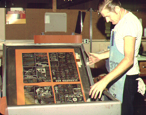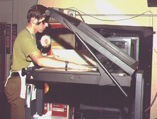 A process camera operator prepares to "shoot" the pages to make large